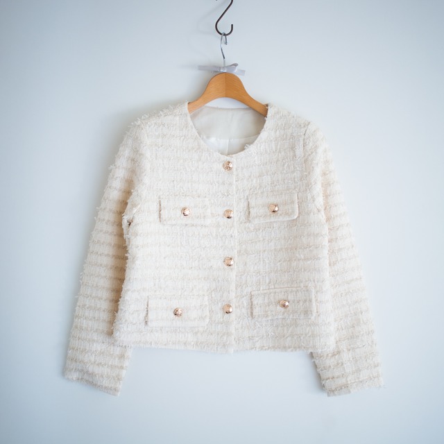 セレモニーからデイリーまで 上品な日常が叶うツイードジャケット シンプルなTシャツに、デニムやチノパンツを合わせることで大人のカジュアルスタイルが完成。 ゴールドのエンブレム釦が程よい華やかさをプラスし、綺麗めコーデはもちろんカジュアルダウンした着こなしにも幅広く対応してくれます。 デイリー使いとしてはもちろん、フォーマルドレスや式典などのオケージョンシーンにも大活躍間違いなし。 ワードローブに加えやすい、万能ジャケットです。 color オフホワイト sizeFREE 肩幅38cmバスト49cm着丈52cm袖丈59cm 素材 ポリエステル70%綿30% 別布 ポリエステル100% 海外製品のため、裁縫のズレや歪みが見られる場合がございますが、初期不良ではございません。また、商品やカラーによって若干サイズが異なる場合がございます。モニターの都合上、撮影画像と実物では多少の色が異なって見える場合がございます。インポート製品について、海外と日本では検品基準が異なりますので、縫い目や糸の始末が粗いものもたまにございます。ご了承の上、お買い求め下さいませ。