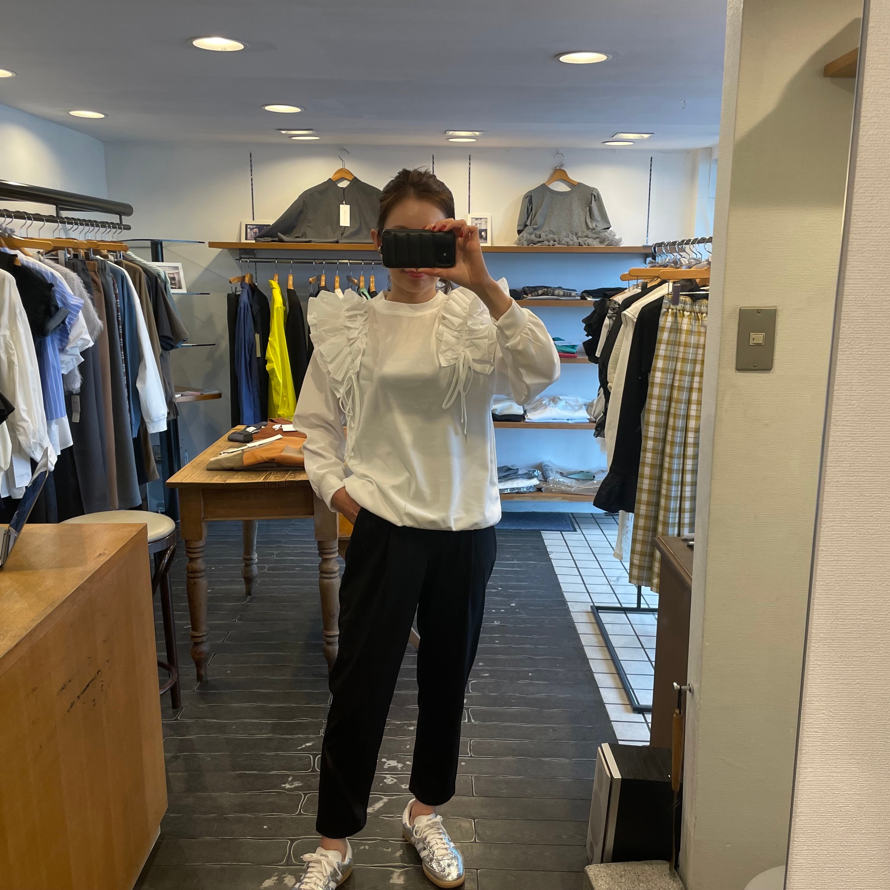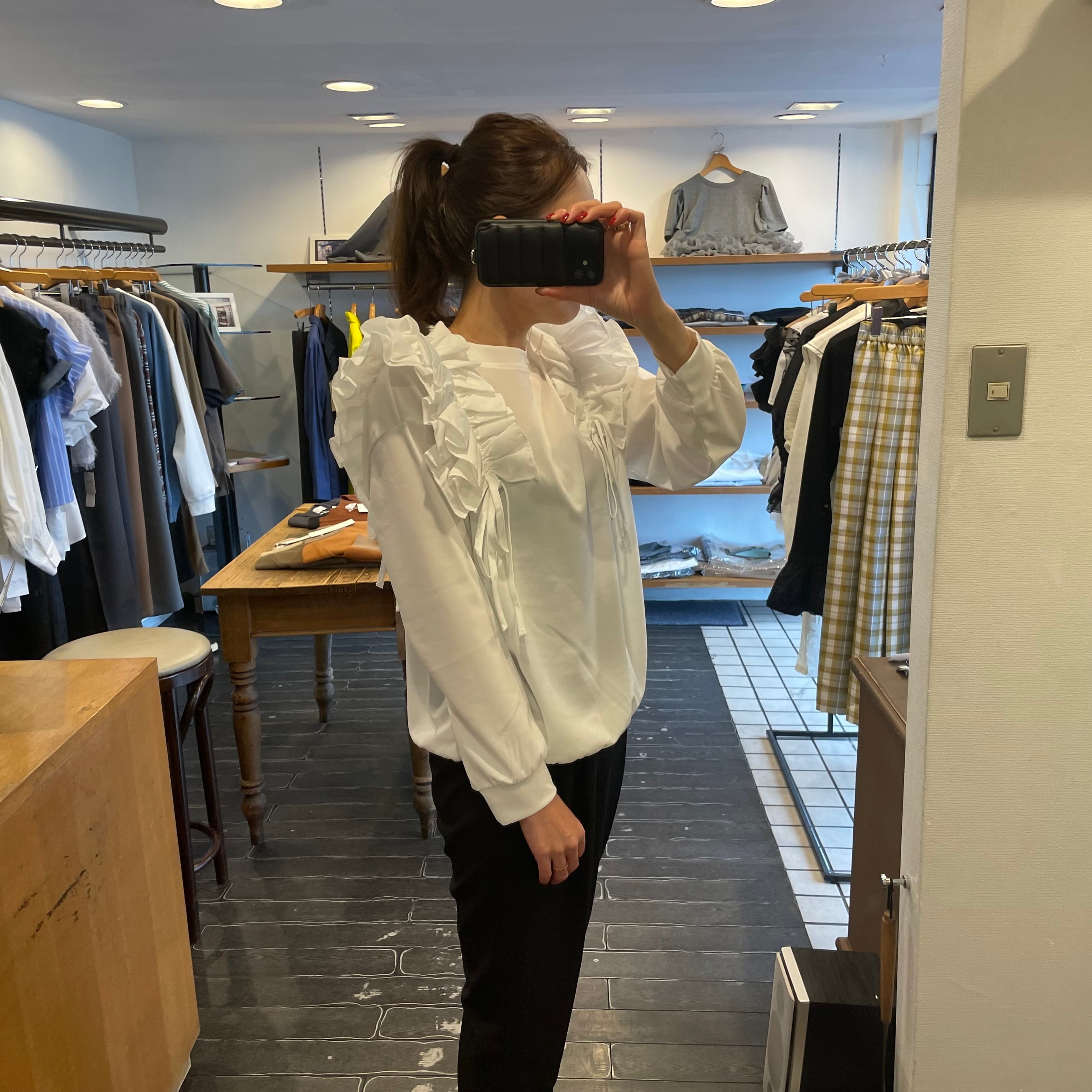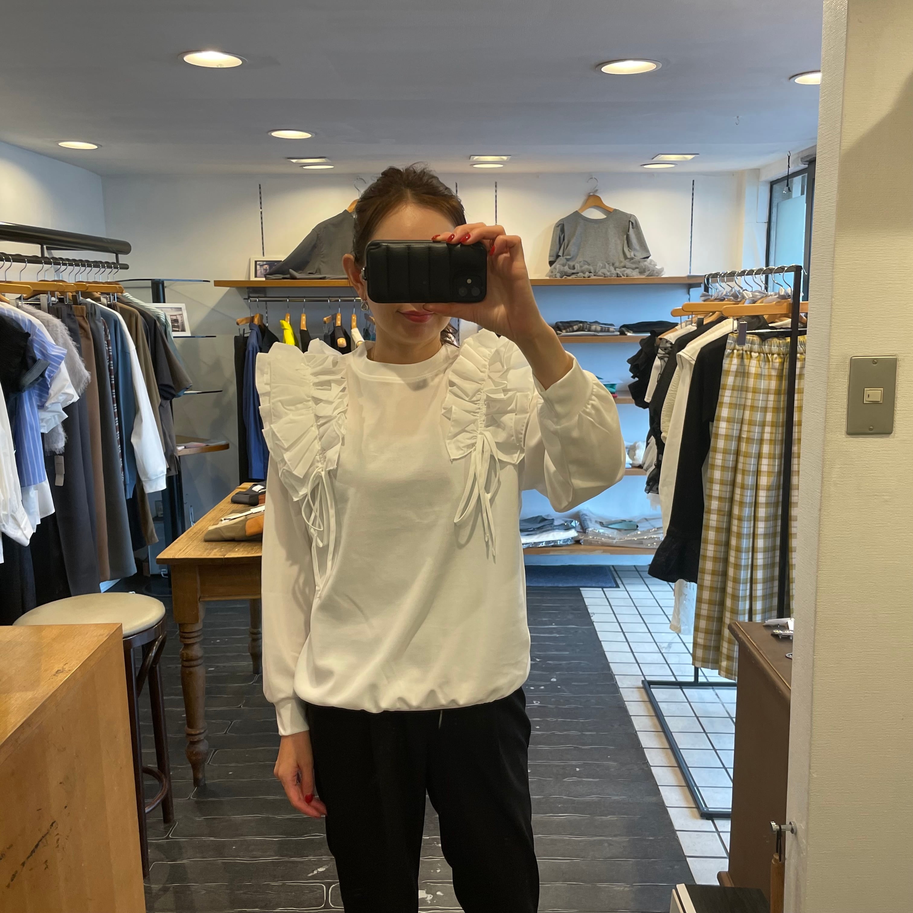 肩部分に施されたギャザーとフリルがフェミニンでエレガントな印象を与え、普段使いはもちろん、ちょっとしたお出かけにもぴったりです。