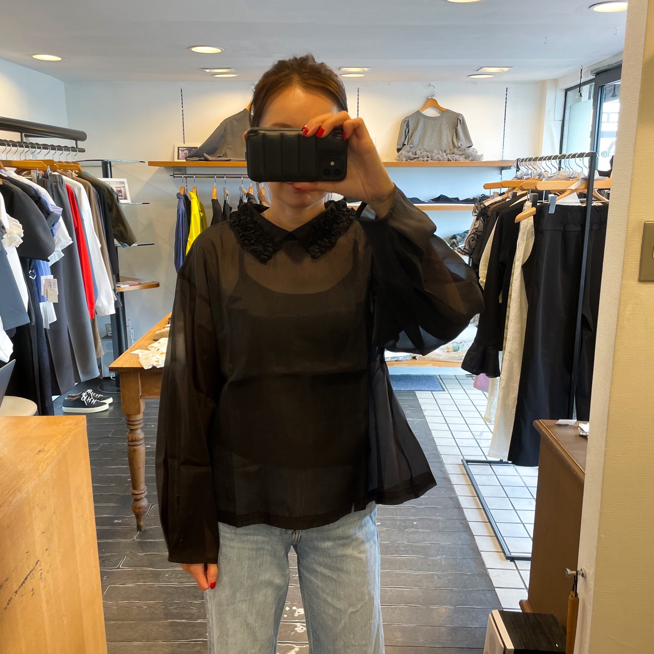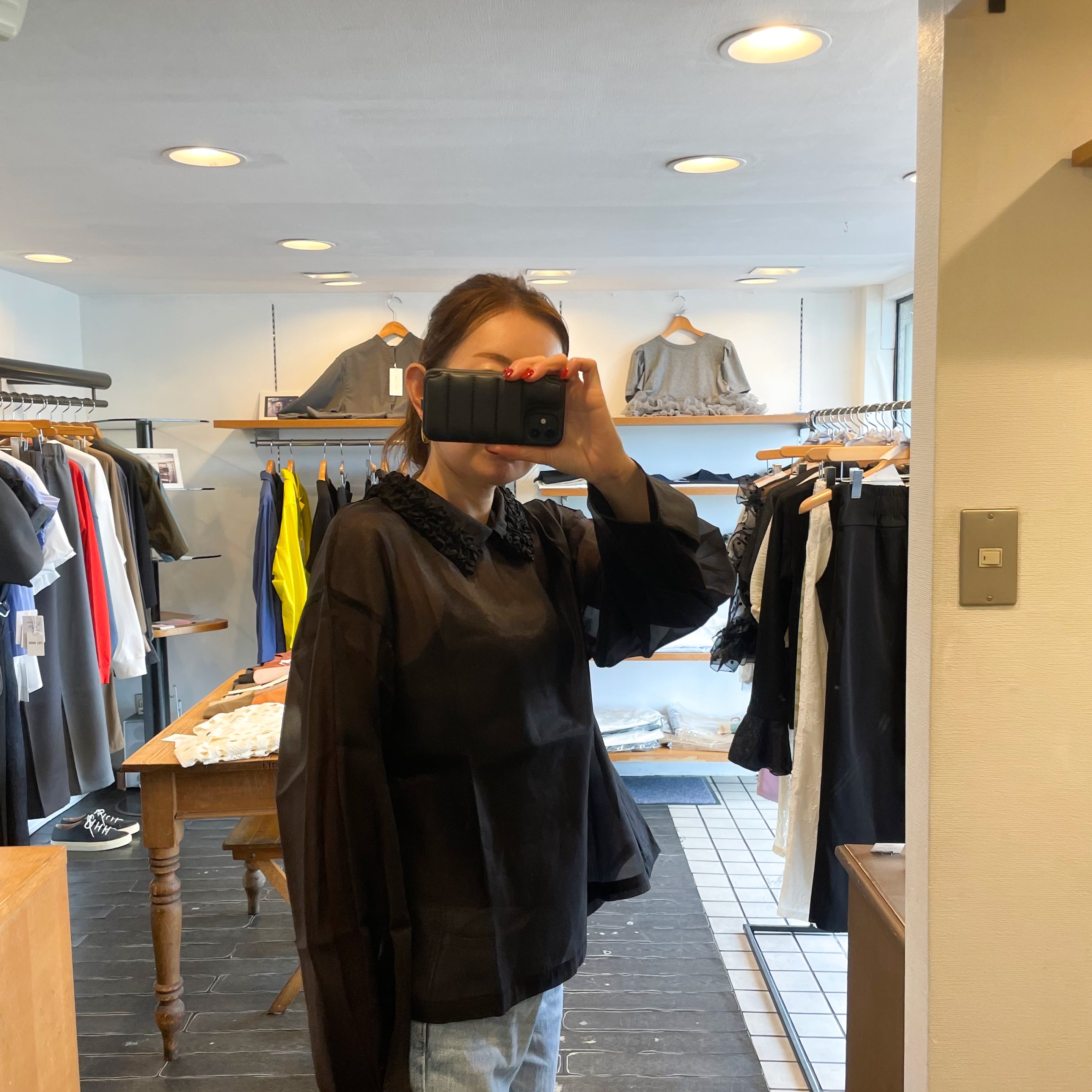 軽やかな透け感素材が、シンプルながらもフェミニンな雰囲気を演出します。