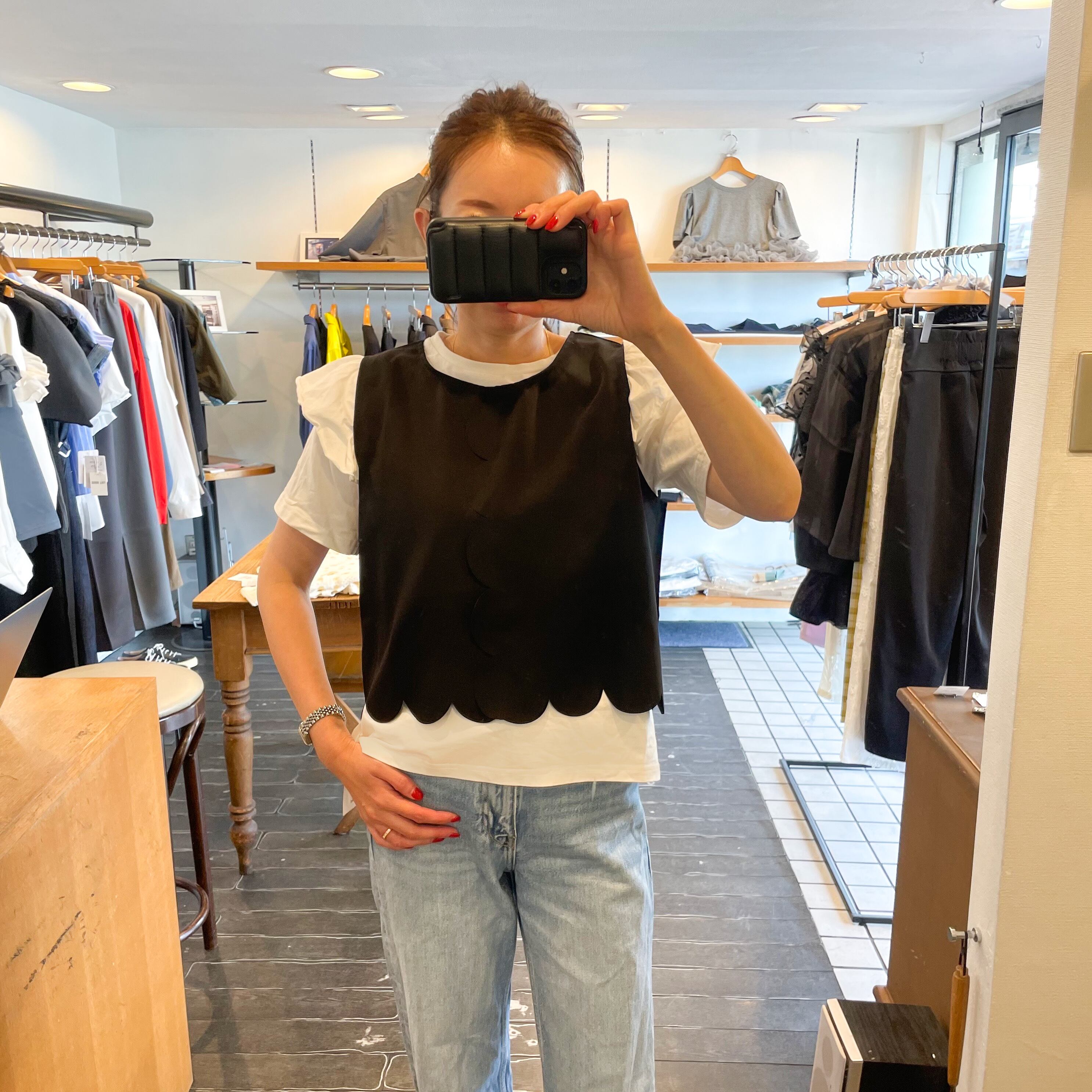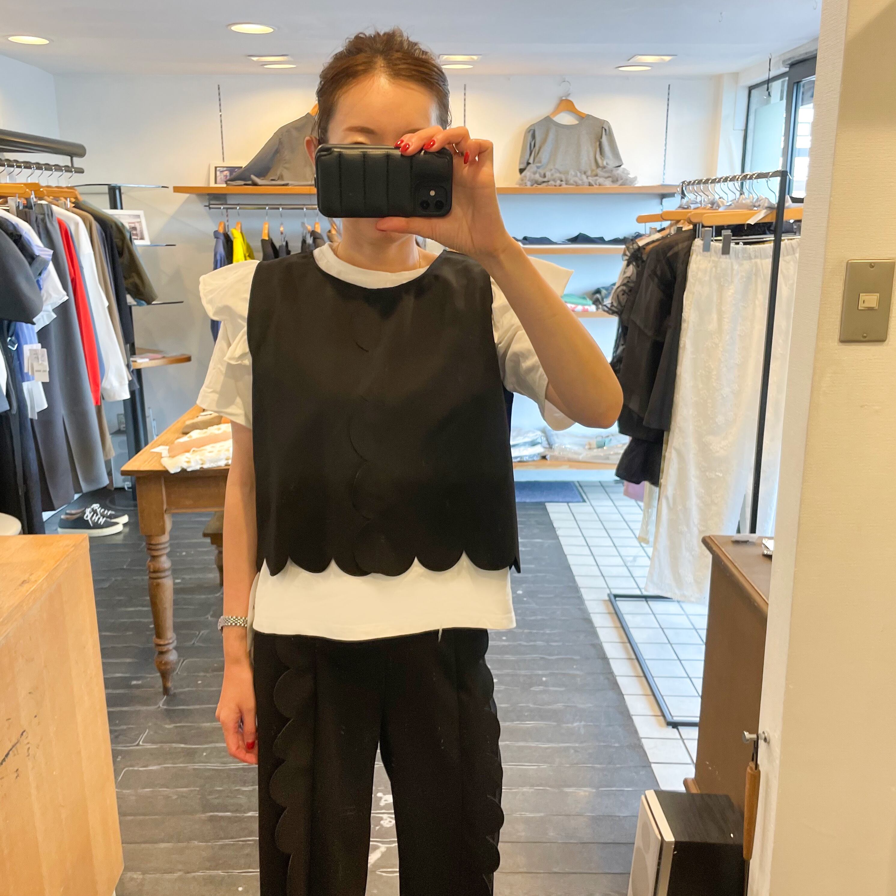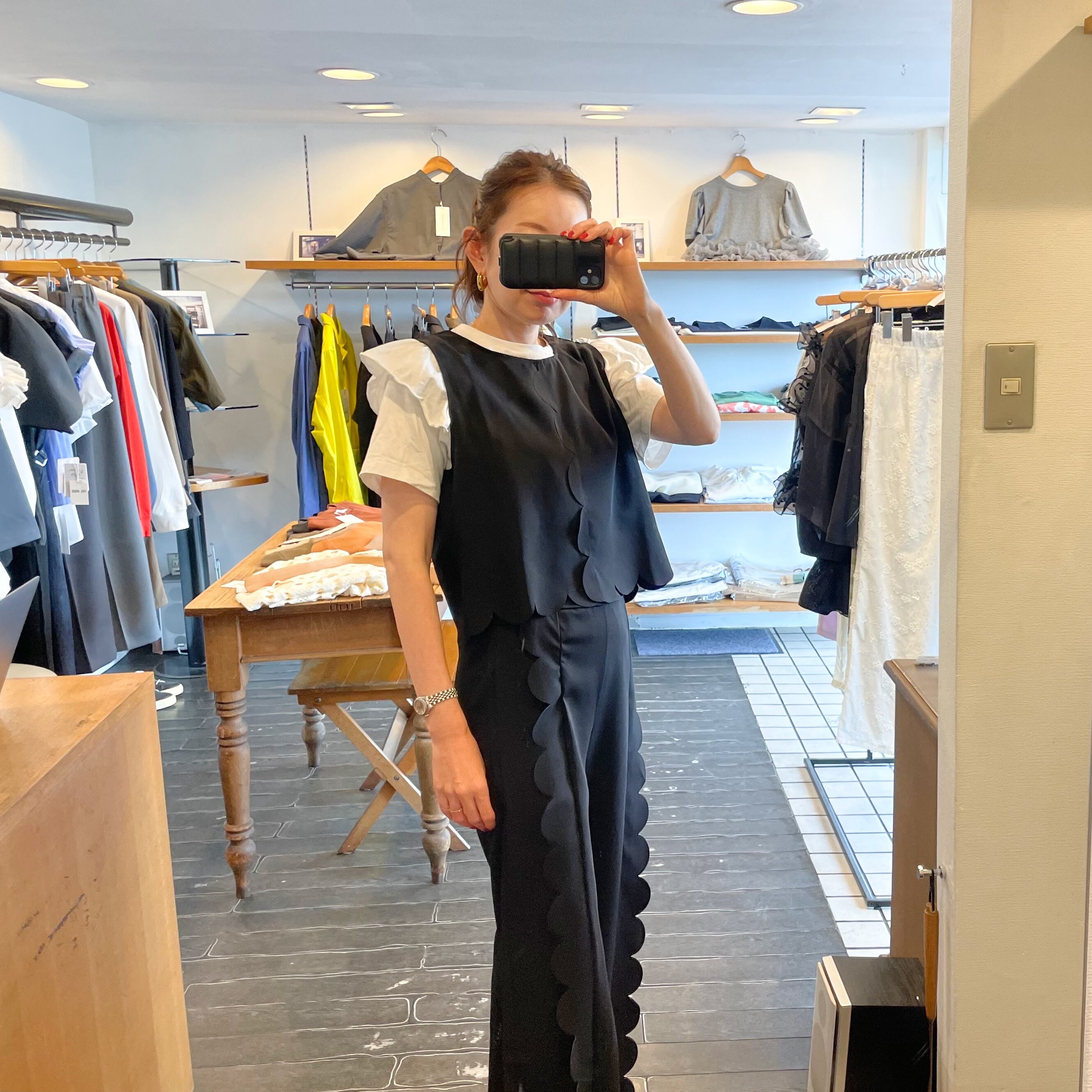 トップスは裾のスカラップカットが女性らしさを演出し、