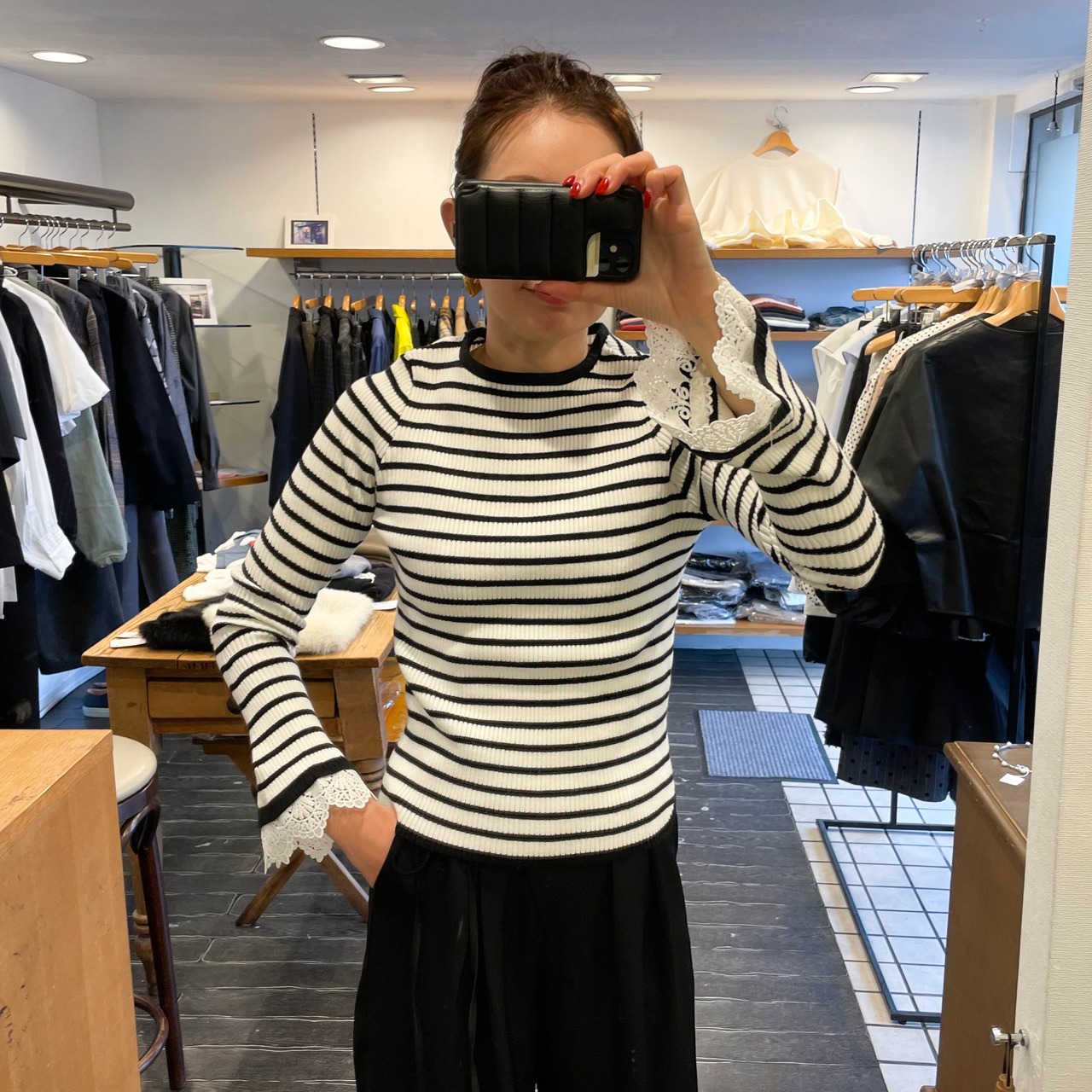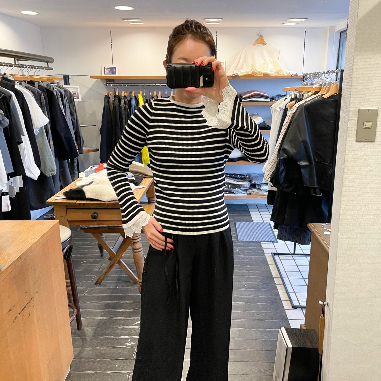 柔らかく肌触りの良いニット素材に、エレガントなレースフリルを組み合わせた一着。デイリーユースだけでなく、特別な日のコーディネートにも華を添えるアイテムです。レースフリルは袖口に女性らしさを引き立てます。