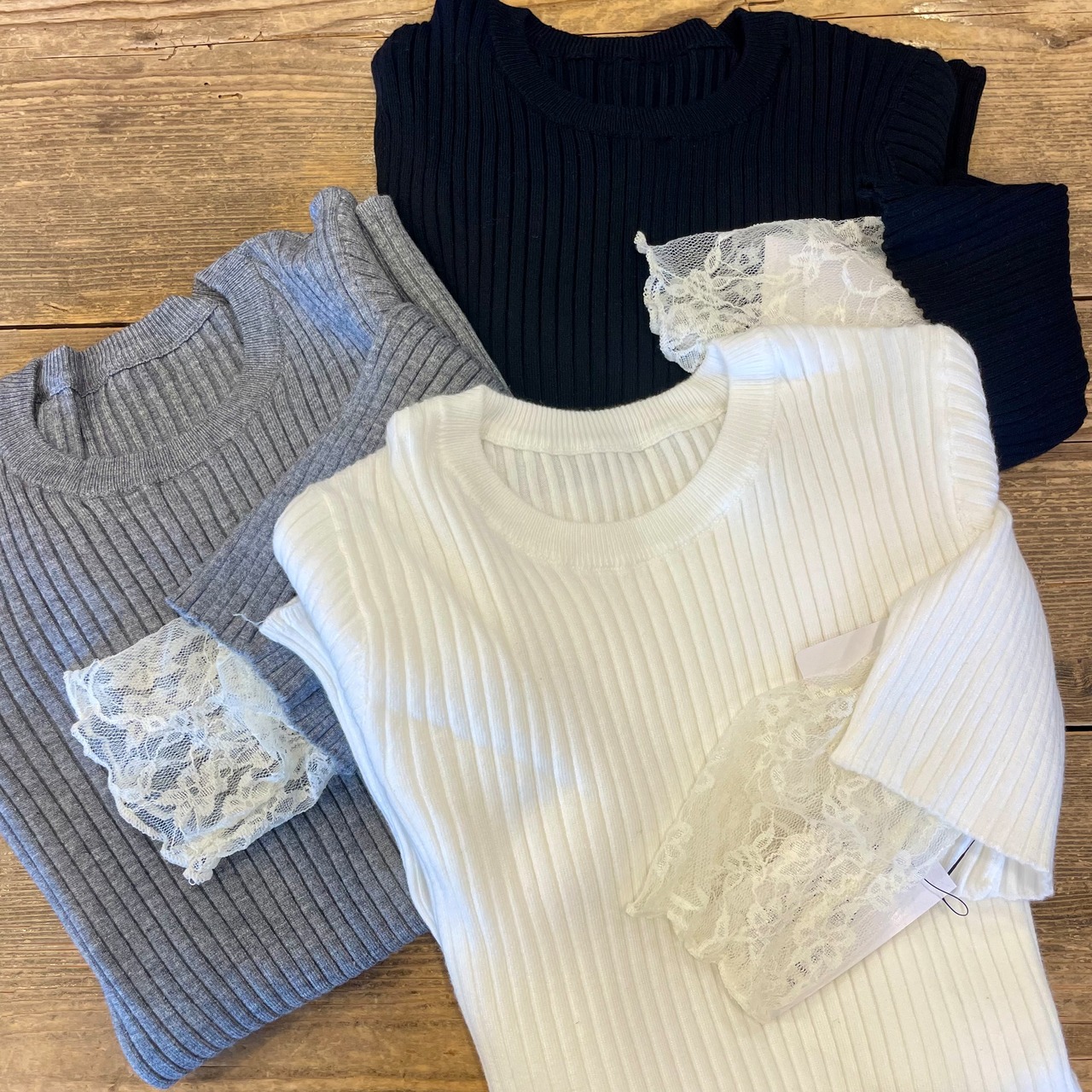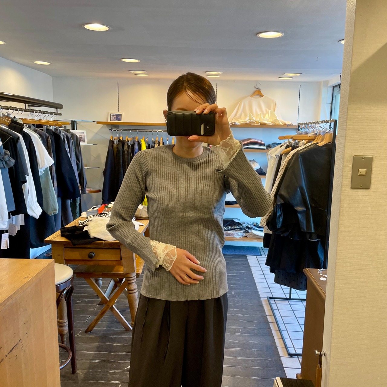 リブニットの柔らかさとレースの繊細さが絶妙に組み合わさり、着心地も抜群。シンプルなボトムスと合わせても、存在感があります。様々なトップスやアクセサリーとの相性も良く、多彩なスタイリングを楽しめます。カジュアルからキレイめまで、お好みに合わせたコーディネートが可能です。