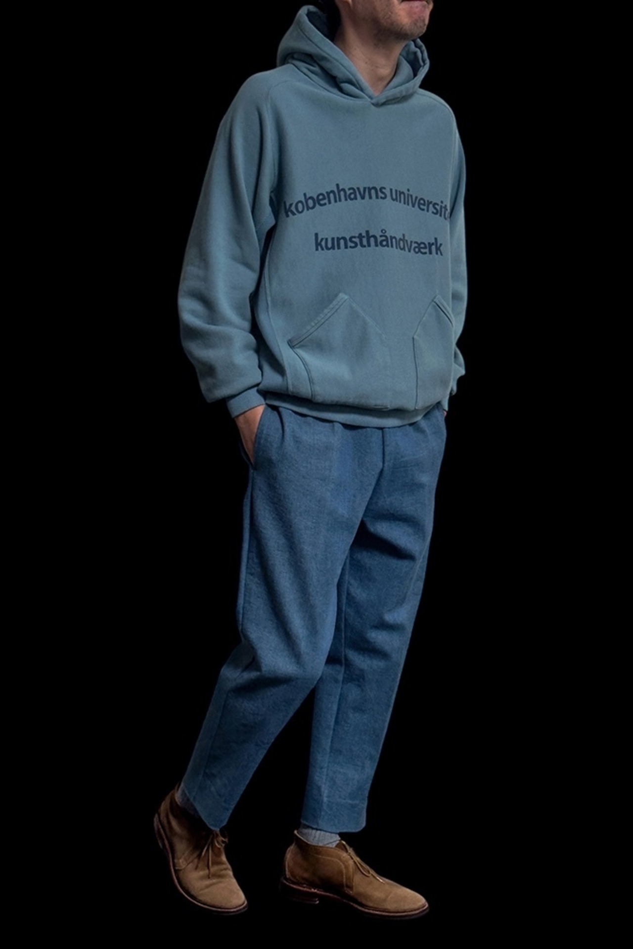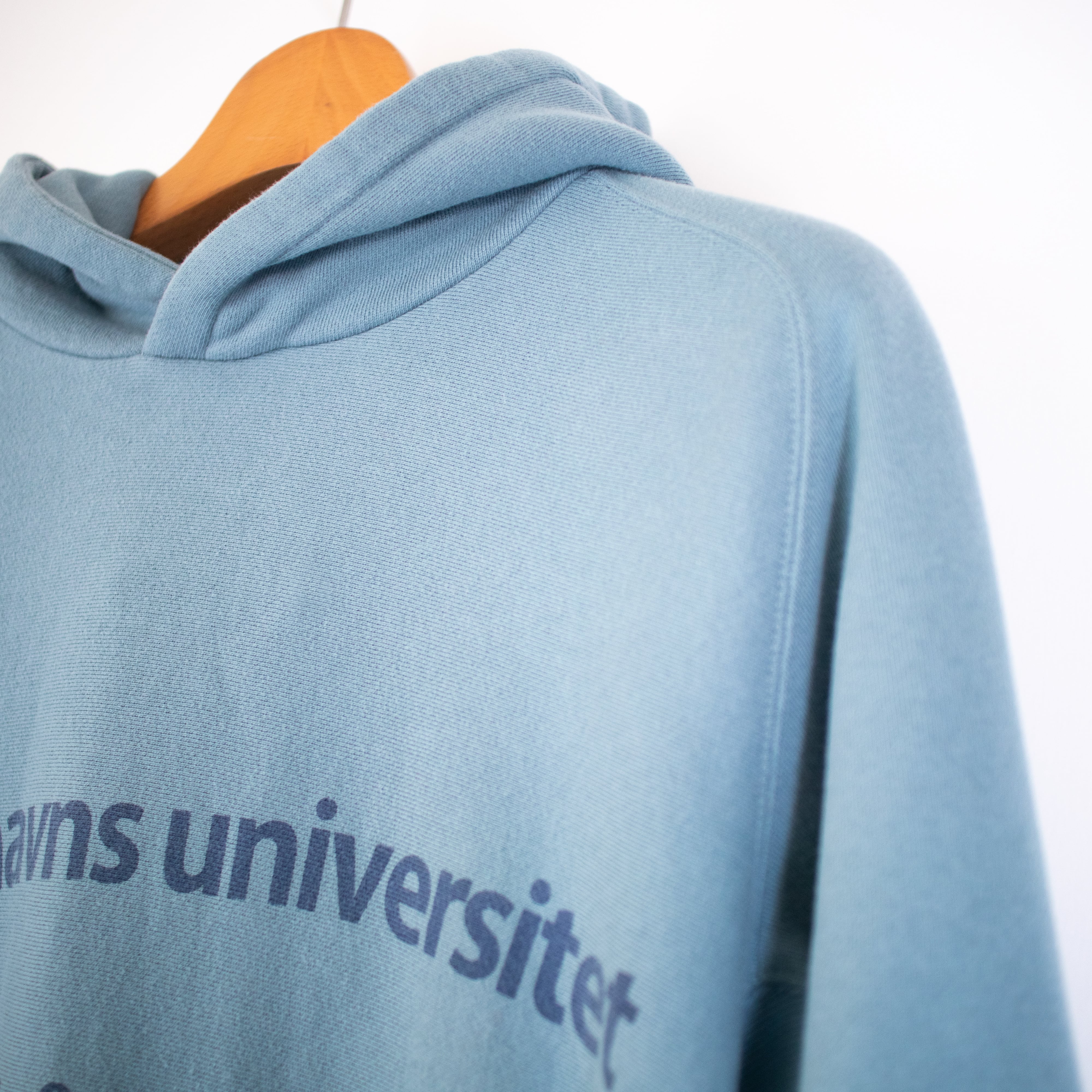 プリントはデンマーク語で、所謂アメリカのカレッジ物のパーカーではなくて、デンマークの古着屋で見つけたようなカレッジ物をイメージしています。