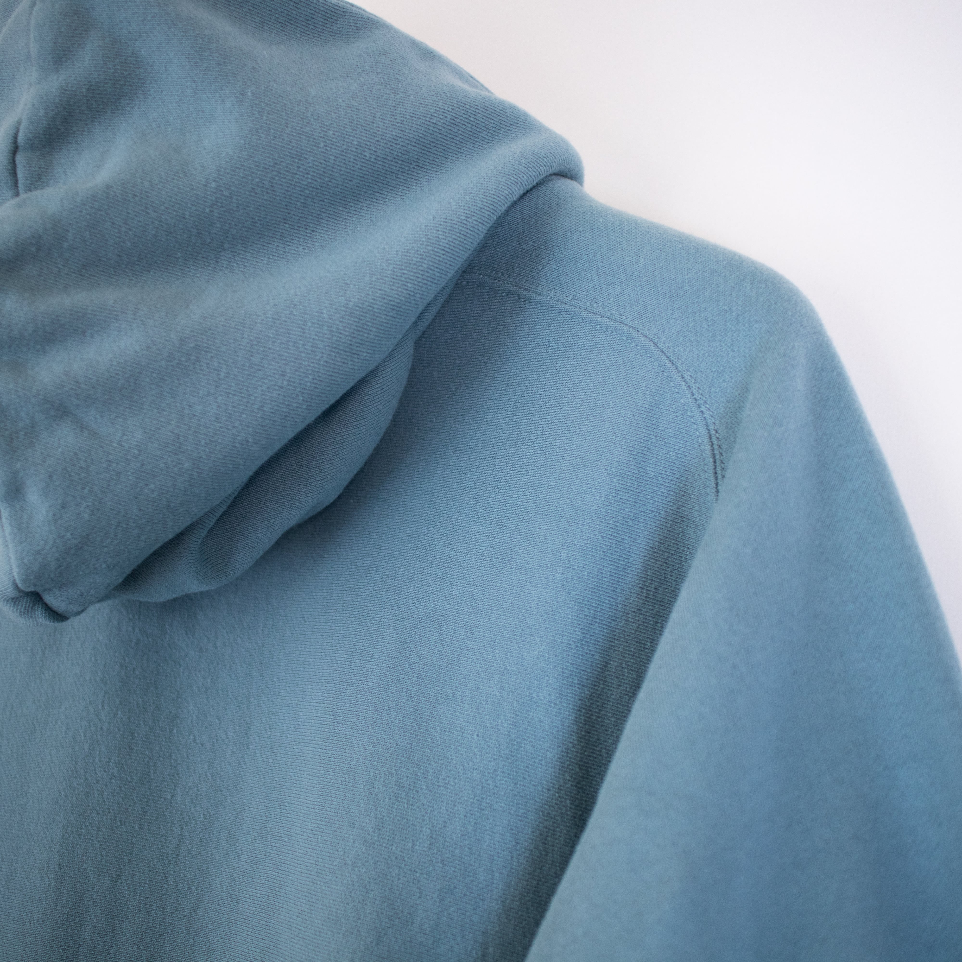 リバースウィーブのように見頃の生地の地の目を縦と横を逆に取っていて、また脇から袖裏のヒジ辺りまで一枚で繋がったリブで構成していたり、変形型のポケットやフリーダムスリーブに 2 本針ステッチにするなど、よりヴィンテージライクなパーカーに仕上げています。スタンダードで標準的なシルエットになります。