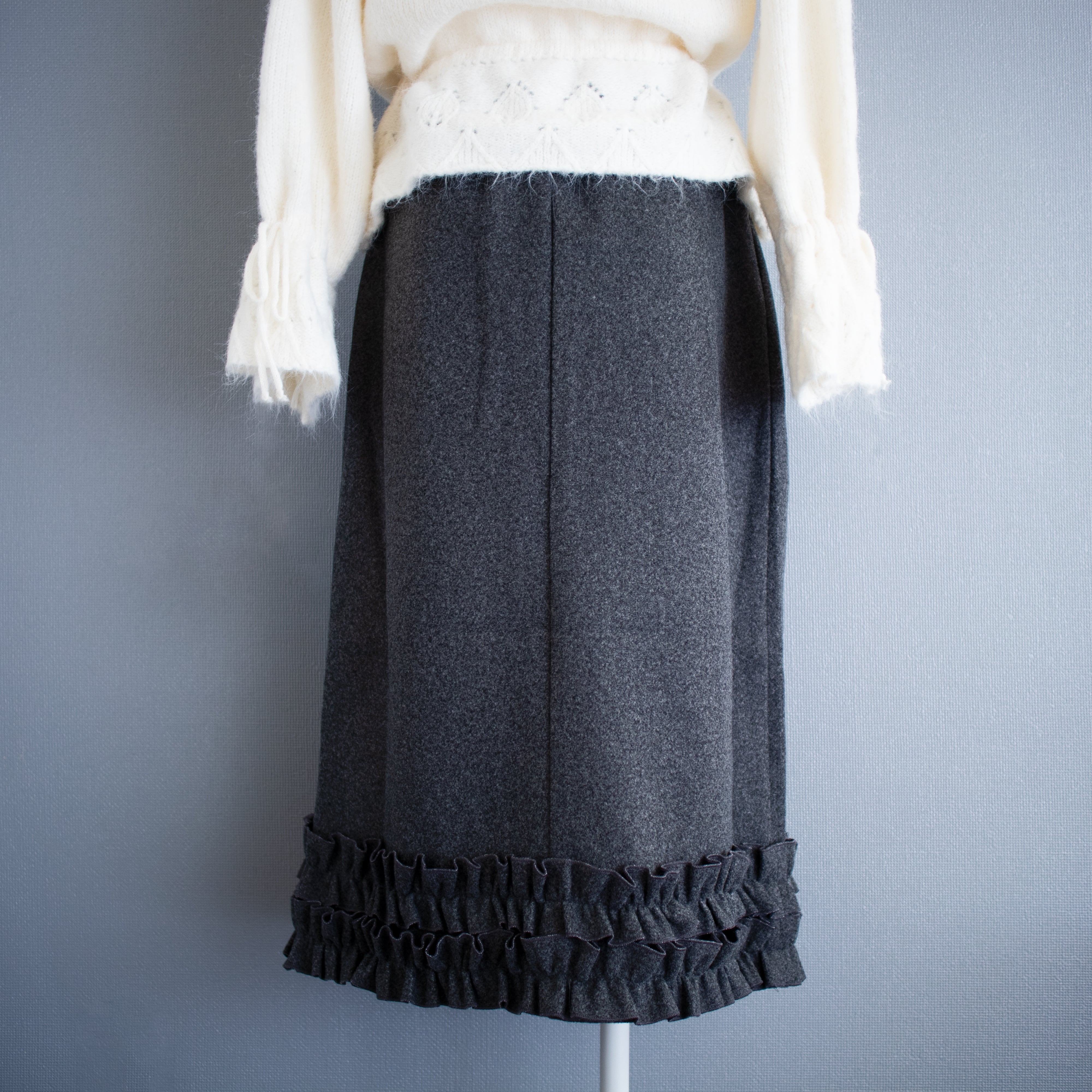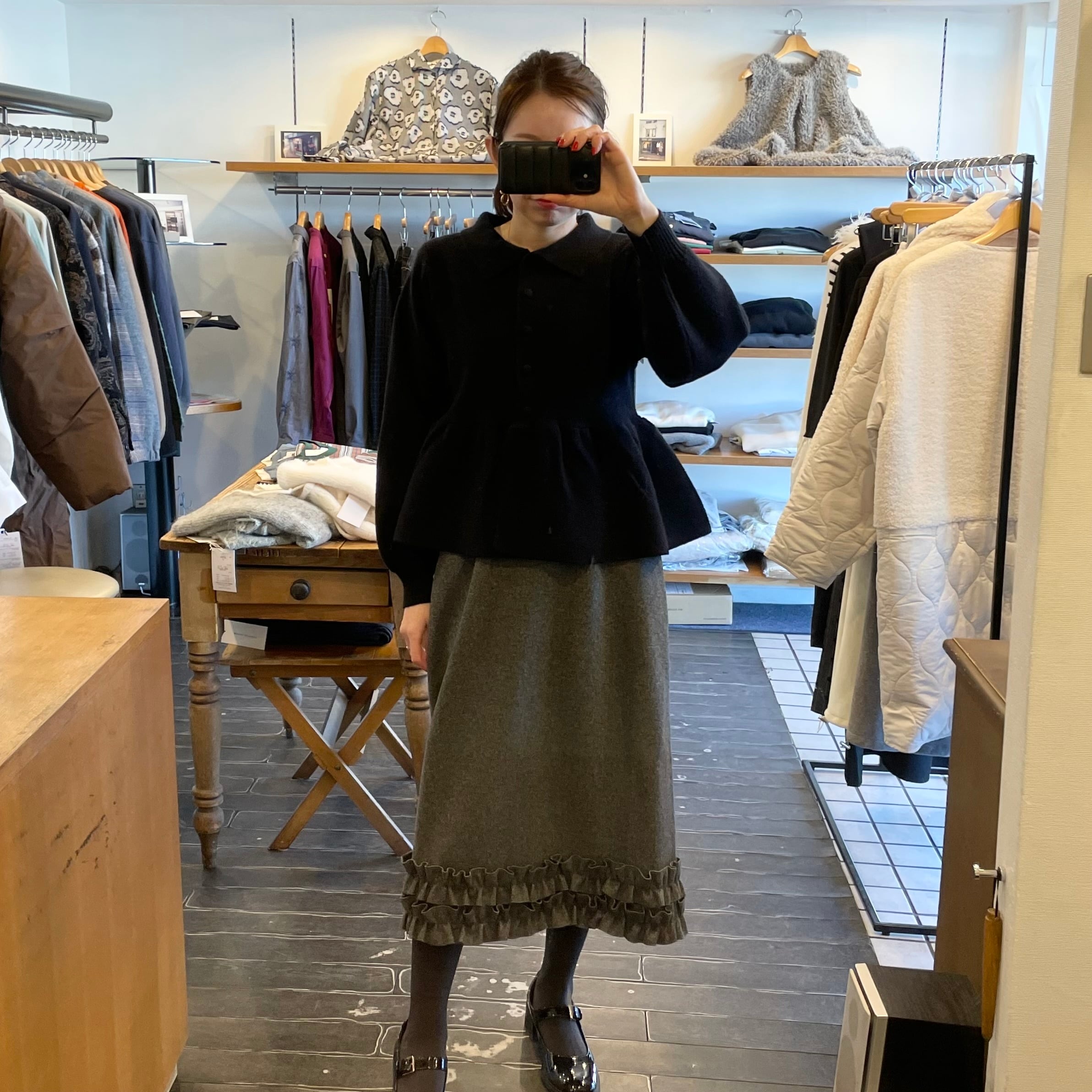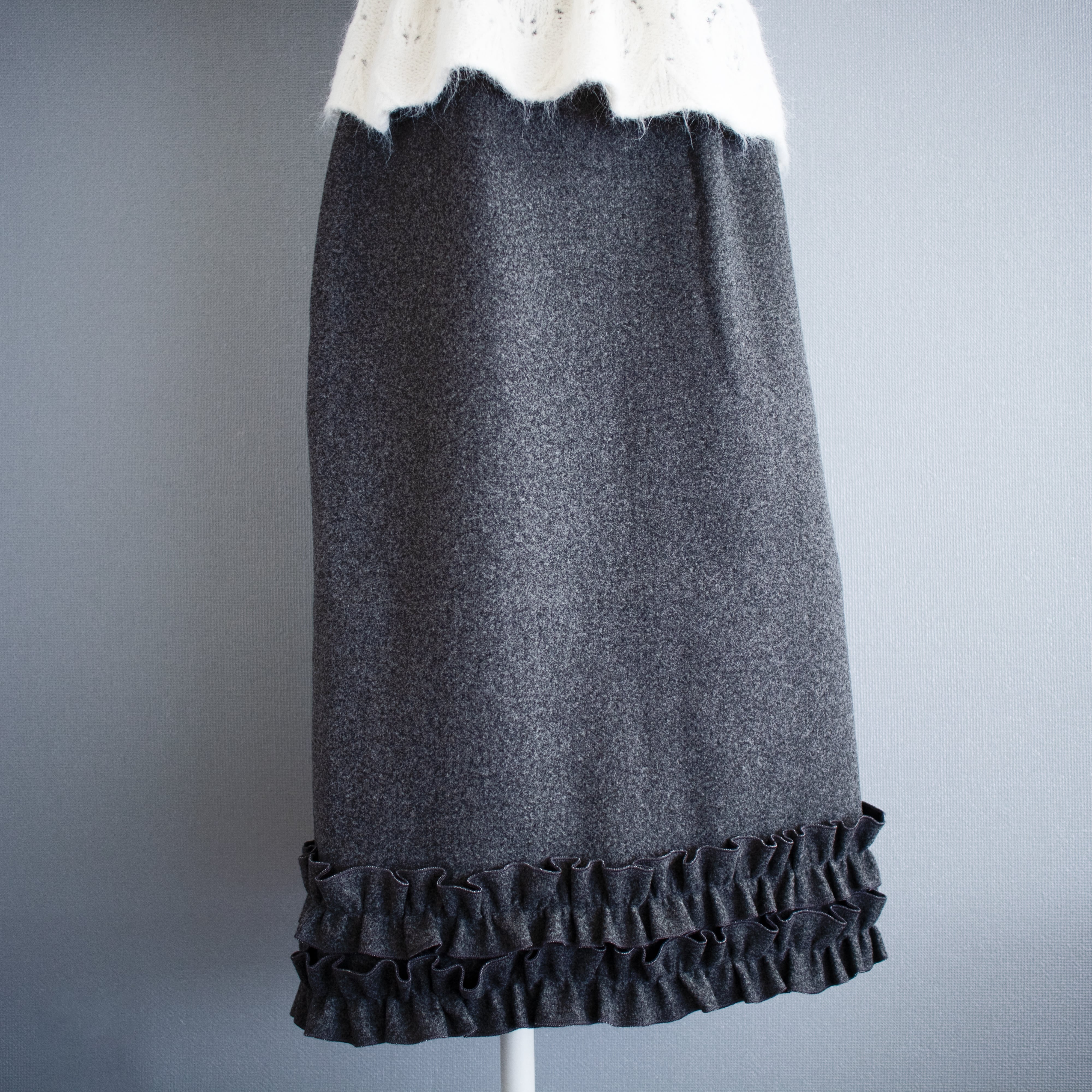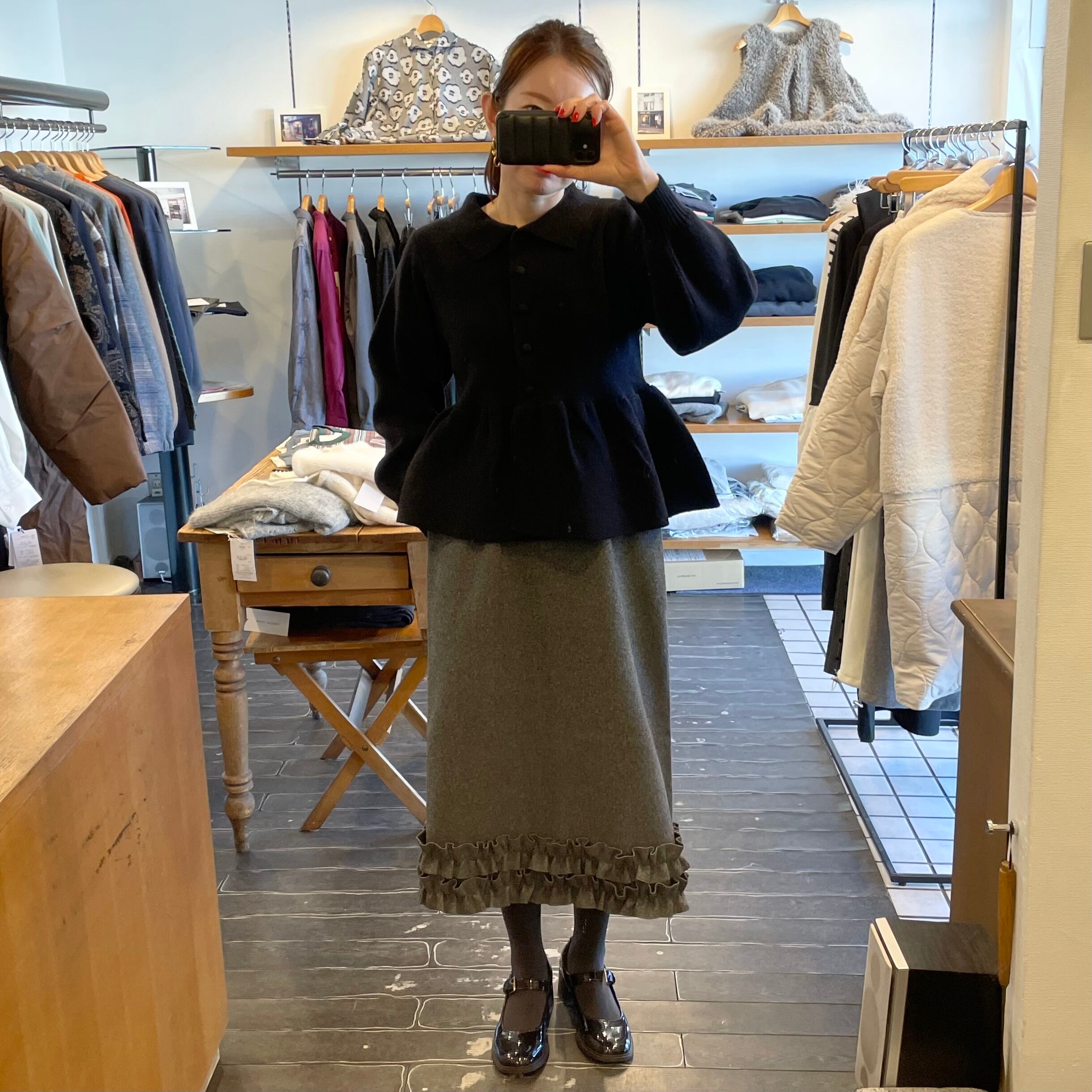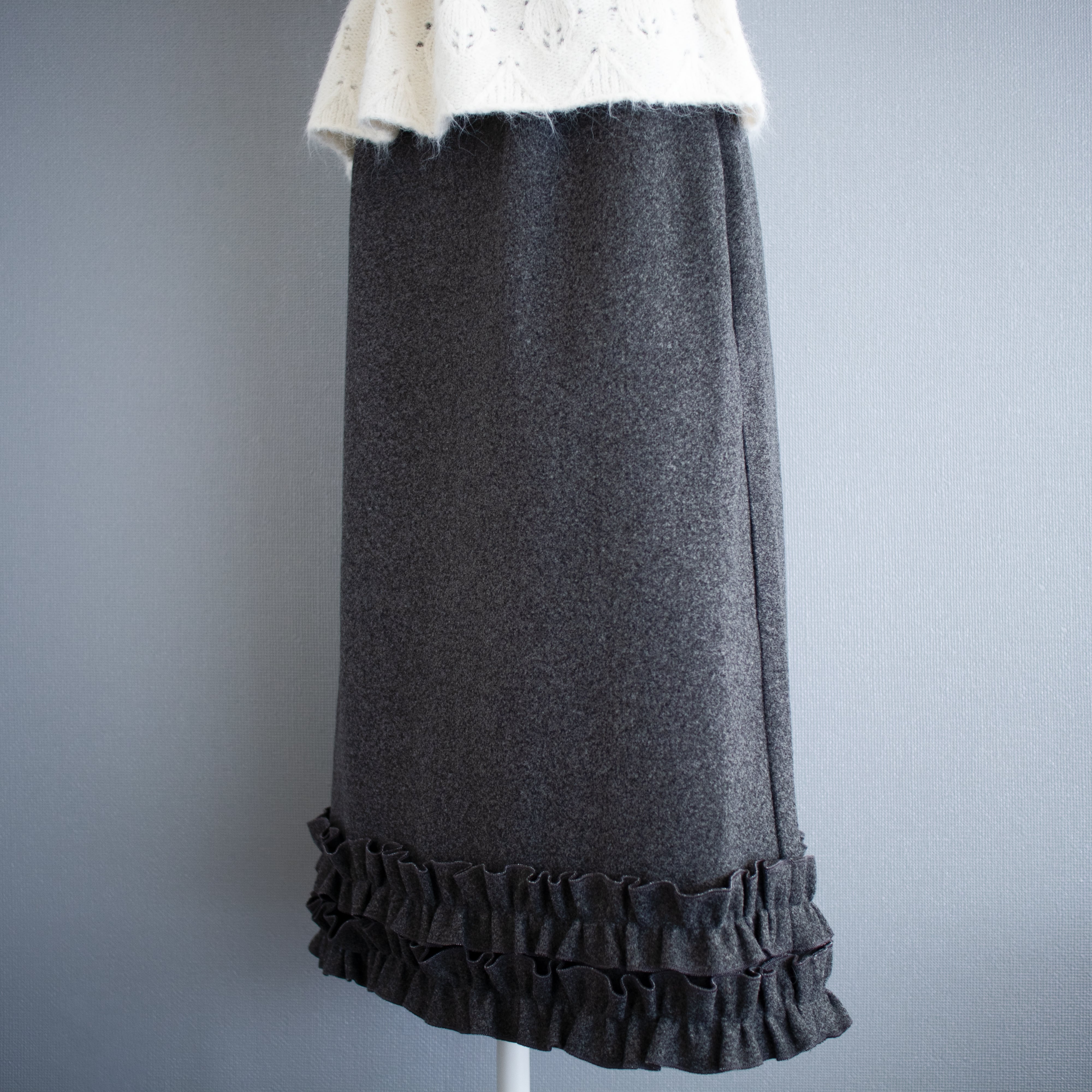 裾にたっぷりとギャザーを寄せたフリルをあしらい、シンプルながらも女性らしさを引き立てるデザイン