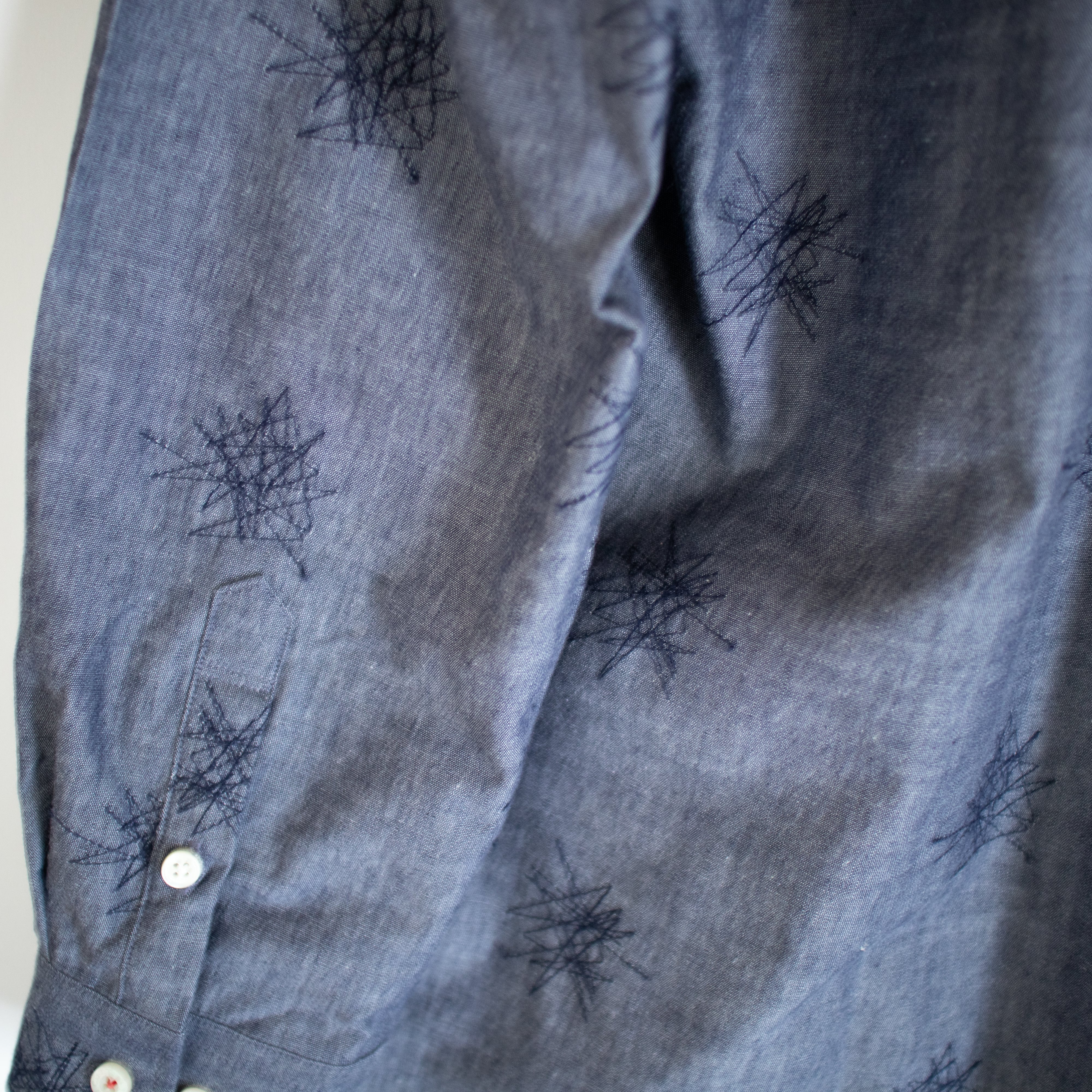 ブルー過ぎない少しグレーがかったカラーのエンブロイダリーダンガリーシャツ。
