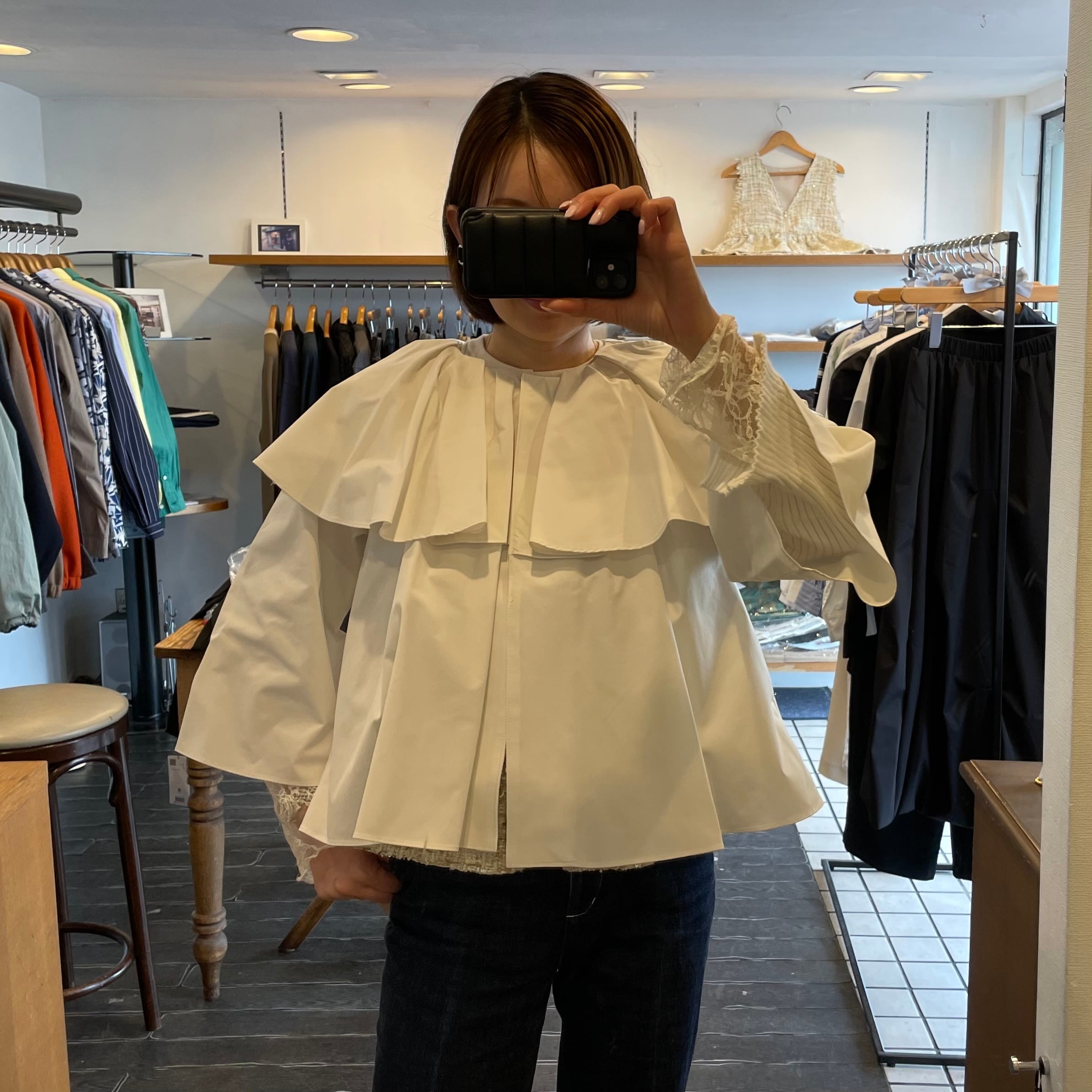 大きめの襟が顔まわりをやさしく彩り、タック入りのデザインが上品な印象に。