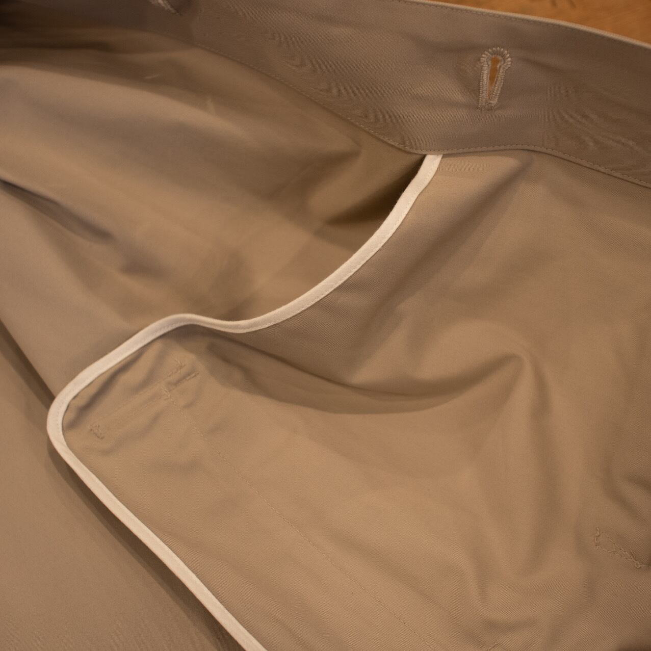 内側の縫製をホワイトコットンでパイピング処理しているので、ボタンを開けて着用した際に見えるワンポイントとして楽しんで頂けます。