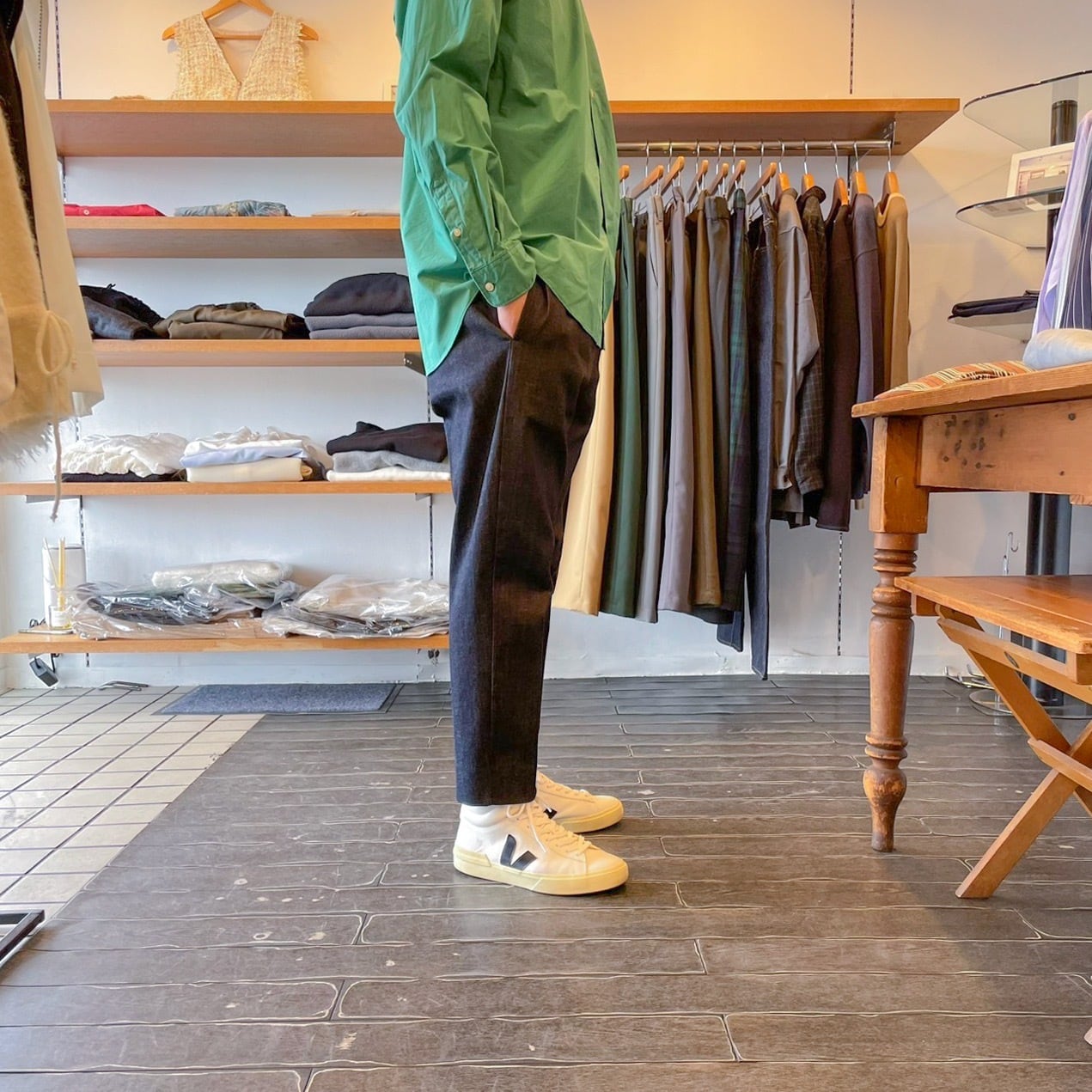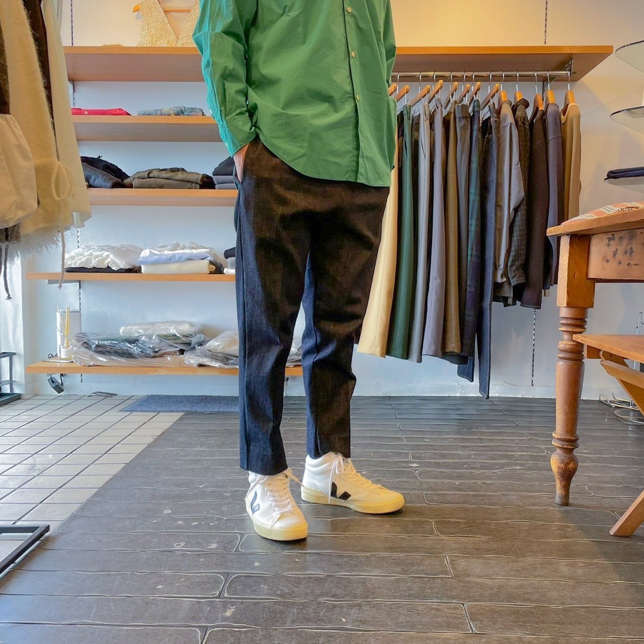 スラックス仕様で8分丈のレングス、スッキリとした印象です。
