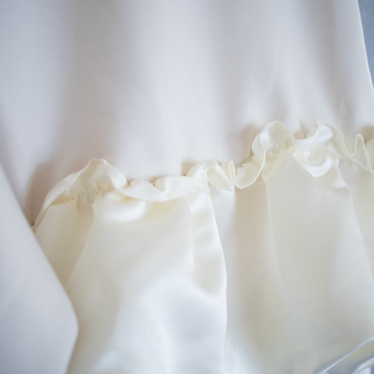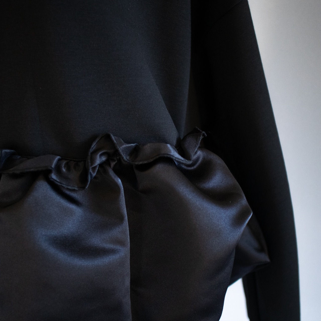 裾にはハリ感や光沢感のある異素材生地をドッキング。