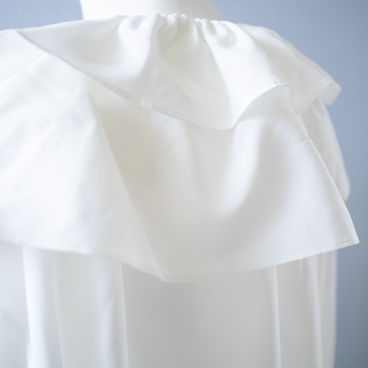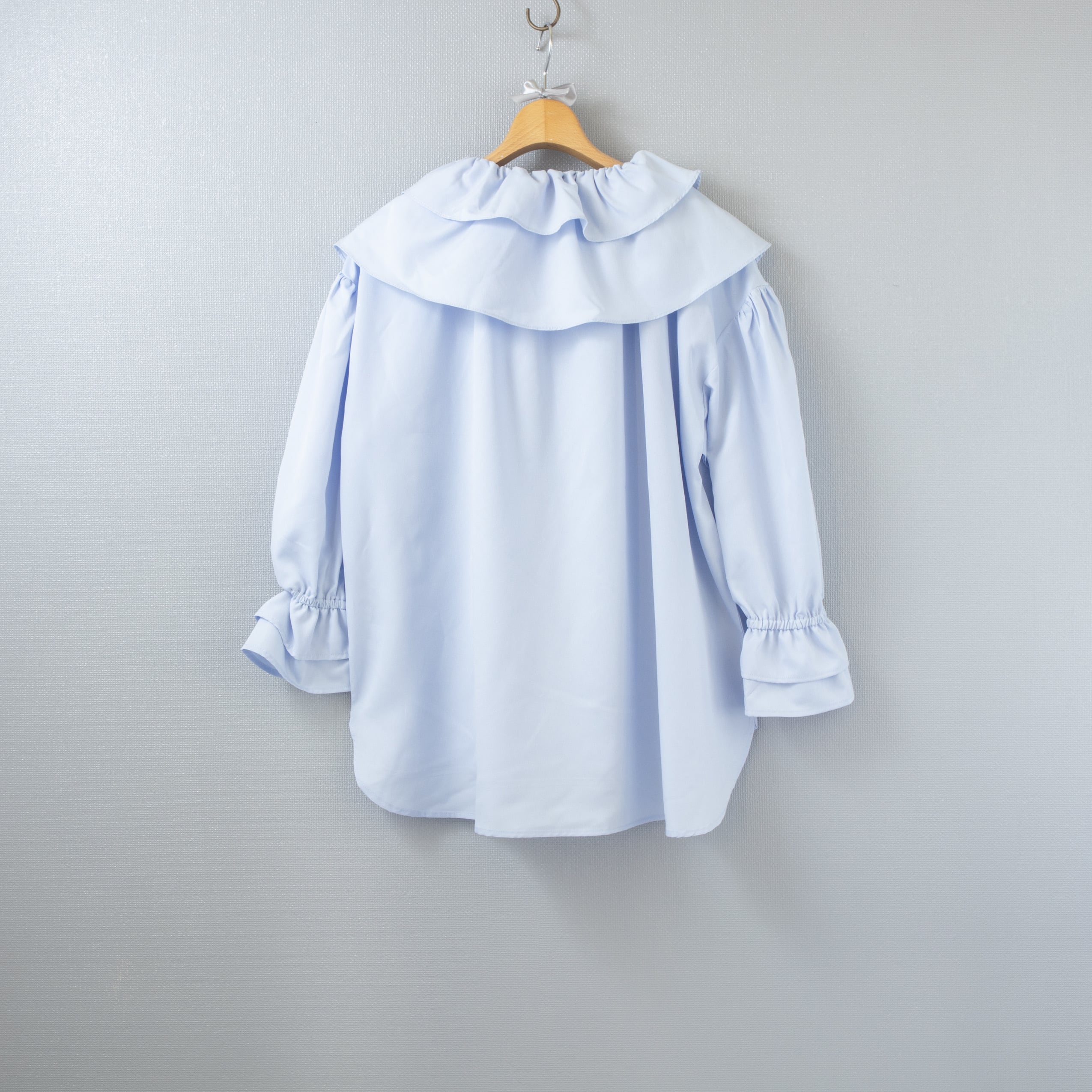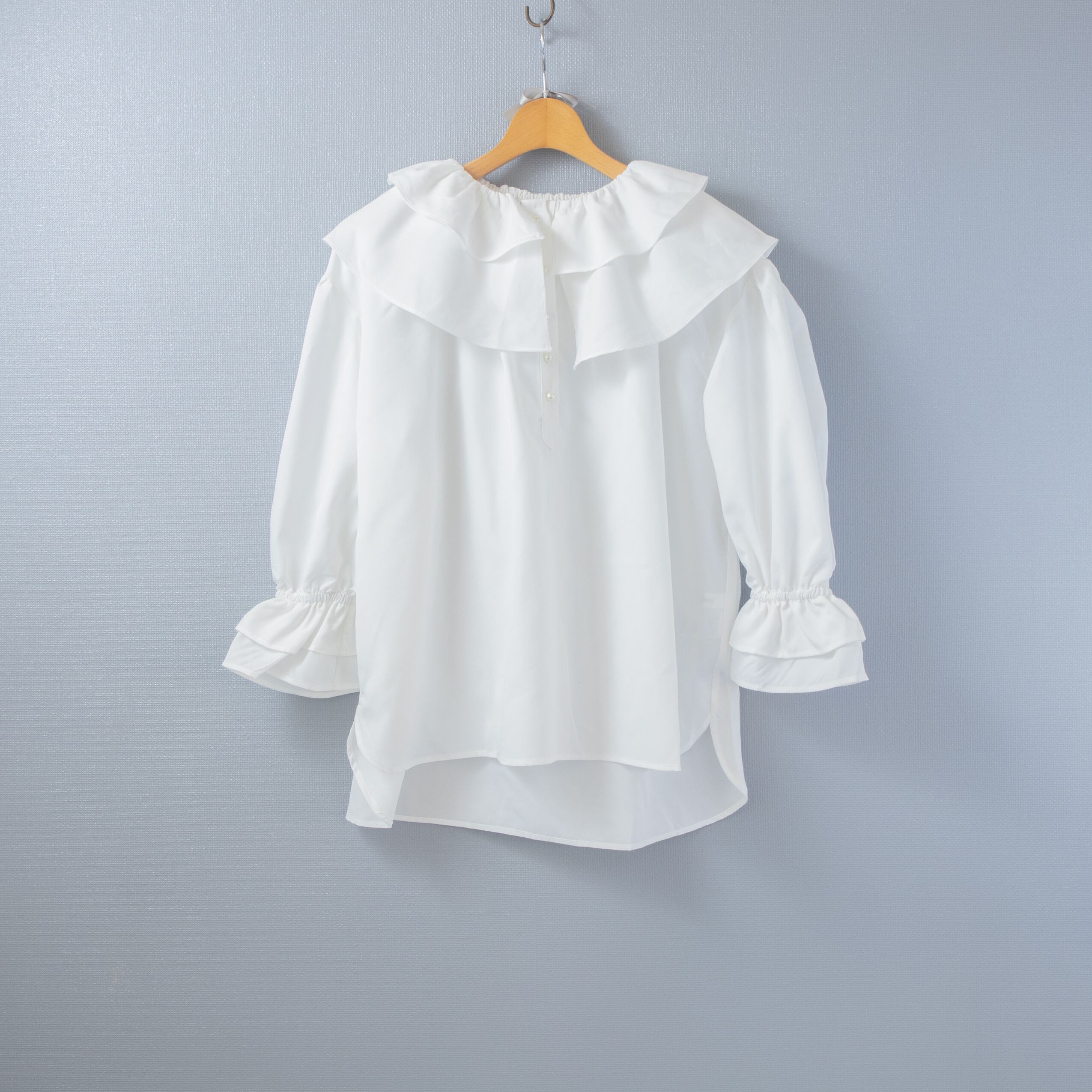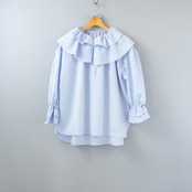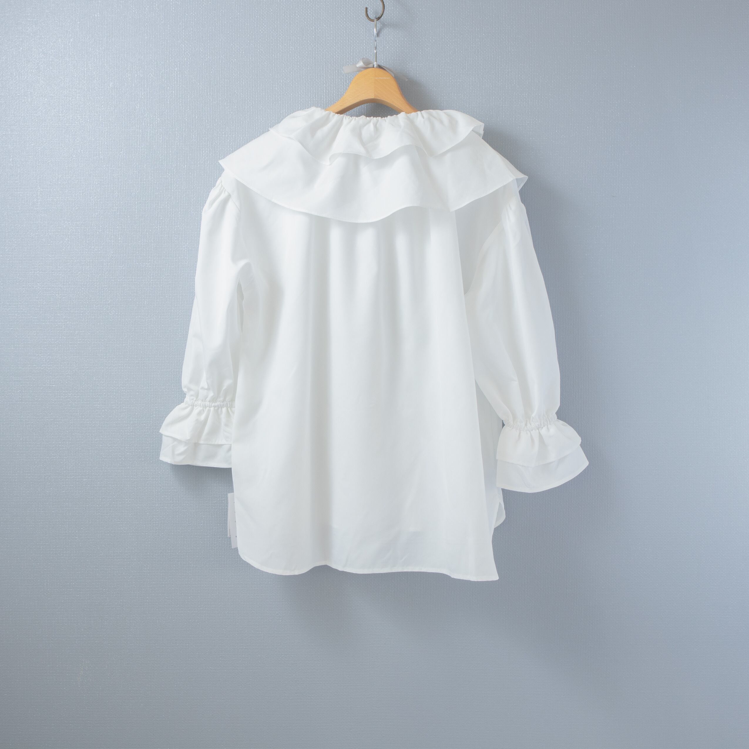 華やかなダブルフリルカラーが印象的なブラウス。ボリューム感のある襟元が顔周りを明るく引き立て、コーディネートの主役になる一着です。柔らかな素材感とゆとりのあるシルエット。パンツスタイルでシャープに、スカートと合わせてフェミニンに仕上げるなど、さまざまなスタイリングが楽しめます。特別なシーンからデイリーまで幅広く活躍するアイテムです。